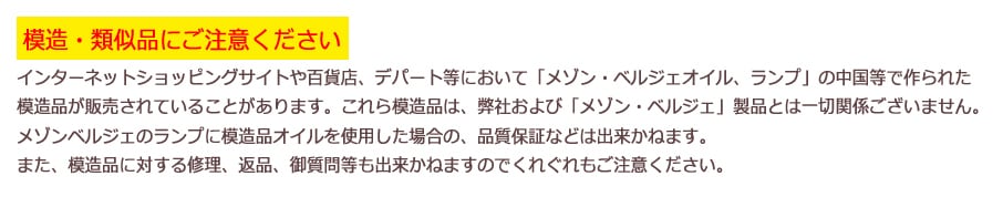 「メゾン・ベルジェ(ランプ・ベルジェ)」製品はすべてフランスで製造されています。特に、パフュームアロマオイルとセラミック芯はフランスの国際安全規格に基づく工場で製造し、日本においては「メゾン・ベルジェ(ランプ・ベルジェ)」パリ社と独占販売契約を締結している「DCHL JAPAN」が日本正規代理店として輸入販売をしています。また、法令順守の為フランスの工場にて、日本語注意書き裏ラベルを添付しDCHL JAPANで販売を行なっています。