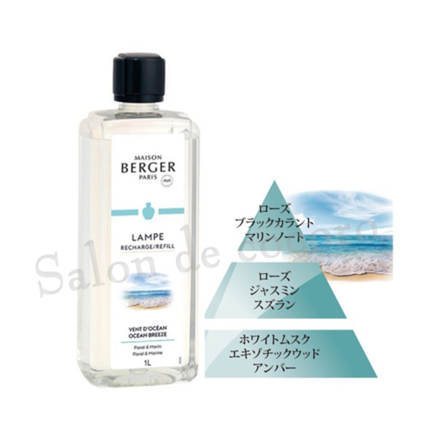香りの分類:フレッシュ系 香りの説明:シトラス系の爽やかさに清涼感を加えた清々しく、年齢を問わず受け入れられやすい香りです。リラックスしたいときに嗅ぐと、前向きな気持ちになれる香りです。 【 香りのピラミッド 】 トップノート:ペパーミント、ペニーロイヤルミント ミドルノート:グラニーアップル、洋ナシ、スズラン、 ラストノート:ムスク、パイン、シダーウッド ●使用方法・・・詳しくはアロマランプの説明書をお読みください。 ●専用のアロマランプで使う、(1)優れた消臭機能を発揮します。(タバコの臭い、ペットの糞尿の臭い、家庭臭、台所の水周りや生ゴミ、新築改築の建物や家具などから発生する不快な臭いなど)。(2)アロマエッセンスによる芳香で心身をリラックス。(別途アロマランプをお買い求め下さい) 販売元:Le Nez株式会社(ルネ株式会社)Lampe Berger Parisランプベルジェ パリ Maison Berger Paris メゾンベルジェ パリ Parfum berger paris パフューム ベルジェ パリ ●販売元:Le Nez株式会社(TEL:03-6820-8966) ●メーカー名:メゾン・ベルジャ パリ ●区分:ルームフレグランス ●製造国:フランス ●内容量:1000ml(画像は参考用の500mlオイルとなります) ご使用上の注意: メゾン・ベルジェアロマランプでの芳香のみにご使用下さい。 ※市販のアルコール類、水などを混入すると芯に点火できなくなり使用不可となる他、重大な事故につながる恐れがありますので絶対にお止め下さい。それらの誤った使用による事故に関しましては、当社は一切の責任を負いかねます。 使用方法 ご使用前にアロマランプ付属の使用説明書をよくお読み下さい。開封にはキャップを左方向に押し回します。アロマランプに補充する際には火の気のない場所で行って下さい。 注意事項 *以下の注意事項を遵守せず万が一事故が発生した場合、当社では責任を負いかねます。正しい使用方法を守り、十分注意してご使用下さい。 1.本来の目的以外でのご使用や、飲用、塗布、入浴剤としてなど体への使用はお止め下さい。 2.香りやアルコールに過度に敏感な方やアレルギーをお持ちの方、または小動物を飼育されている場合は、使用時間や濃度などに十分ご配慮下さい。お子様や妊娠中の方も、香りに敏感に反応する場合がありますので、気分が悪くなった場合はすぐに使用を中止してください。 3.喘息の方、あるいは喘息の方がいる場所での抗菌オイルのご使用をなるべくお控え下さい。 4.使用中はお子様の手の届かない場所に置き十分注意して下さい。 5.移動中の車内、また、電車や共有スペースなど公共の場でのご使用はお控え下さい。 6.オイルが目に入った時や、皮膚や顔に付着した時は速やかに水で洗い流し、異常がある場合は医師に相談して下さい。 7.オイルを誤って飲用した時はすぐに口をすすぎ医師に相談して下さい。 8.芯に点火する前にランプ周囲にオイルが漏れていないことを確認し、漏れている場合は必ず拭き取ってからご使用下さい。 9.オイルが家具や床にこぼれた場合、そのまま放置すると塗料が剥がれ変色の原因となります。すぐに拭きとり水拭きをし、塗料が剥げた場合はワックスをかけることをお勧めします。 10.使用中のランプ上部は大変熱くなっておりますのでご注意下さい。 11.開封後のオイルはキャップをしっかり閉め、なるべくお早目にお使い下さい。 12.オイルを保管する場合、火気や熱源の付近ならびに直射日光を避け、常温で保管して下さい。誤飲事故を防ぐため、他のボトルへの入れ替えはお控え下さい。