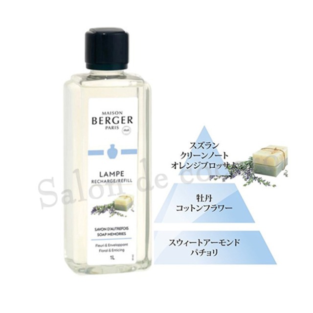 商品詳細: 【 Chant de Lavande 】 ラベンダー 分類:フローラル・ドリーム ウッディー調のフローラルな香りに、クリアさとスパイシーさをプラスしました。甘みを抑えたので、気分に合わせてリフレッシュにもリラックスにもお使いいただけます。 【 香りのピラミッド 】 トップノート:ユーカリ、洋ナシ、カンフル ミドルノート:ラベンダー ラストノート:バーム、ウッディー 容量1000ml★独自に開発されたセラミックバーナー芯と必ずベルジェパリ専用ランプを併せてご使用下さい。セラミックバーナー芯とパフュームアロマオイルの併用によって触媒反応が発生、火を吹き消してから炎のない燃焼で消臭、芳香効果発揮。火を2分点火後に炎を吹き消してから無炎燃焼し、芳香と消臭がスタート。約20m2で約40分燃焼させると消火キャップで停止させても香りは約2~4時間(環境による)持続。燃焼時のオイル消費は1時間約25ml、500mlで約20時間(1Lで約40時間)燃焼が可能。 販売元:Le Nez株式会社(ルネ株式会社)Lampe Berger Parisランプベルジェ パリ Maison Berger Paris メゾンベルジェ パリ Parfum berger paris パフューム ベルジェ パリ ●販売元:Le Nez株式会社(TEL:03-6820-8966) ●メーカー名:メゾン・ベルジャ パリ ●区分:ルームフレグランス ●製造国:フランス ●内容量:1000ml ご使用上の注意: メゾン・ベルジェアロマランプでの芳香のみにご使用下さい。 ※市販のアルコール類、水などを混入すると芯に点火できなくなり使用不可となる他、重大な事故につながる恐れがありますので絶対にお止め下さい。それらの誤った使用による事故に関しましては、当社は一切の責任を負いかねます。 使用方法 ご使用前にアロマランプ付属の使用説明書をよくお読み下さい。開封にはキャップを左方向に押し回します。アロマランプに補充する際には火の気のない場所で行って下さい。 注意事項 *以下の注意事項を遵守せず万が一事故が発生した場合、当社では責任を負いかねます。正しい使用方法を守り、十分注意してご使用下さい。 1.本来の目的以外でのご使用や、飲用、塗布、入浴剤としてなど体への使用はお止め下さい。 2.香りやアルコールに過度に敏感な方やアレルギーをお持ちの方、または小動物を飼育されている場合は、使用時間や濃度などに十分ご配慮下さい。お子様や妊娠中の方も、香りに敏感に反応する場合がありますので、気分が悪くなった場合はすぐに使用を中止してください。 3.喘息の方、あるいは喘息の方がいる場所での抗菌オイルのご使用をなるべくお控え下さい。 4.使用中はお子様の手の届かない場所に置き十分注意して下さい。 5.移動中の車内、また、電車や共有スペースなど公共の場でのご使用はお控え下さい。 6.オイルが目に入った時や、皮膚や顔に付着した時は速やかに水で洗い流し、異常がある場合は医師に相談して下さい。 7.オイルを誤って飲用した時はすぐに口をすすぎ医師に相談して下さい。 8.芯に点火する前にランプ周囲にオイルが漏れていないことを確認し、漏れている場合は必ず拭き取ってからご使用下さい。 9.オイルが家具や床にこぼれた場合、そのまま放置すると塗料が剥がれ変色の原因となります。すぐに拭きとり水拭きをし、塗料が剥げた場合はワックスをかけることをお勧めします。 10.使用中のランプ上部は大変熱くなっておりますのでご注意下さい。 11.開封後のオイルはキャップをしっかり閉め、なるべくお早目にお使い下さい。 12.オイルを保管する場合、火気や熱源の付近ならびに直射日光を避け、常温で保管して下さい。誤飲事故を防ぐため、他のボトルへの入れ替えはお控え下さい。