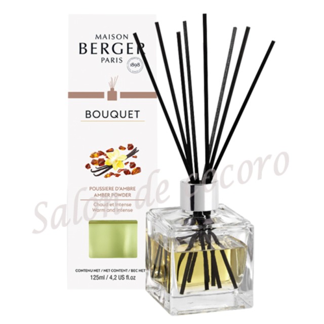 ウイルス、菌対策のパフュームオイル活用方法 一般的にイソプロピルアルコールは50~70%が効果にふさわしい濃度といわれていますが、ランプベルジェのオイルは、エタノールと同じアルコール系の純度の高いイソプロピルアルコールを使用しております。 ウイルスや抗菌の対策として市販の消毒用アルコール製品がございますが、ランプベルジェのオイルも対策として、ランプを焚く事で活用することも可能です。 ※ランプベルジェのオイルは手・指・皮膚の除菌・殺菌・消毒剤ではありません。肌に直接付ける等はお止め下さい。新型コロナウイルス、インフルエンザへの効果は確認できておりません。感染予防のために、石けん等による入念な手洗いとうがいなどをお勧めしております。 フランスで1898年創業から127年の歴史を誇るアロマのパイオニア【メゾンベルジェパリ社】待望のこの製品は火を使わず、MADE IN FRANCE本場のフランスのアロマを気軽に体験出来る素晴らしい製品です。 スティックタイプは、差すだけでフランスの素晴らしいアロマが悪臭を中和して広がり、アロマスティックの本数を増減させる事により、『香りの強さ』と『芳香時間の調節』が可能です。玄関、キッチン、リビング、洗面所、トイレ、お風呂場、寝室、子供部屋、仕事場など火を使わないので何処でも常時悪臭を中和して、フランスの本物の素晴らしいアロマを楽しめます。 お勧めの使用方法は、はじめにスティック8本全て差し込むのでは無く、4本からスタートして、香りが弱いかな?又は4本でスタートしてから1or2週間経過したかな?と感じたら1本づつ増やす方法です。 ※スティックをローズ(ラウンド用)別売りに変更して、ガラスの瓶に差しアロマを楽しむ事が出来ます。 使用期間:約4週間(スティック8本使用)から8週間(スティック2本から4本使用) ※使用環境、スティックの数により変わります。 内容量:125ml 芳香持続時間:約4~8週間 香りの特徴 トップは果実とマリーン系を組み合わせたフレッシュなローズアコード。華やかな花の香りが漂うミドルノートに、ラストノートでは落ち着いたウッディーな香りが広がります。 <香りのピラミッド> トップノート:ローズ、ブラックカラント、マリンアコード ミドルノート:ローズ、ジャスミン、スズラン ラストノート:アンバー、ホワイトムスク、エキゾチックウッド ※スティックをローズ(ラウンド用)別売りに変更して、ガラスの瓶に差しアロマを楽しむ事が出来ます。 使用期間:約4週間(スティック8本使用)から8週間(スティック2本から4本使用) ※使用(風通しの良し悪し)環境、スティックの数により変わります。 内容量:125ml