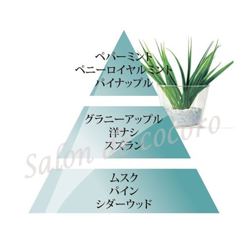 シトラス系の爽やかさに清涼感を加えた清々しく、年齢を問わず受け入れられやすい香りです。リラックスしたいときに嗅ぐと、前向きな気持ちになれる香りです。
