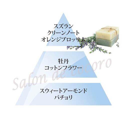 コットンフラワーのピュアで可憐な香りをメインに、スズランなどのフローラルな香りがソフト感を加え、ラストでスイートアーモンドの深い香りが広がる心地よいフレグランスです。